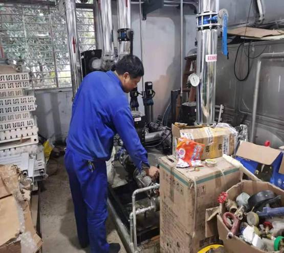 (圖為維修人員在特飛所小區(qū)熱交換站檢查供熱設備)